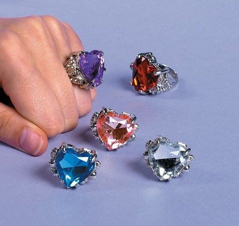 These jeweled heart rings are perfect for Valentine's Day or party favors. Each ring bears a 1" heart "gemstone" to show how much you care. Fun party favors for Valentine's Day or for dress-up or princess parties.